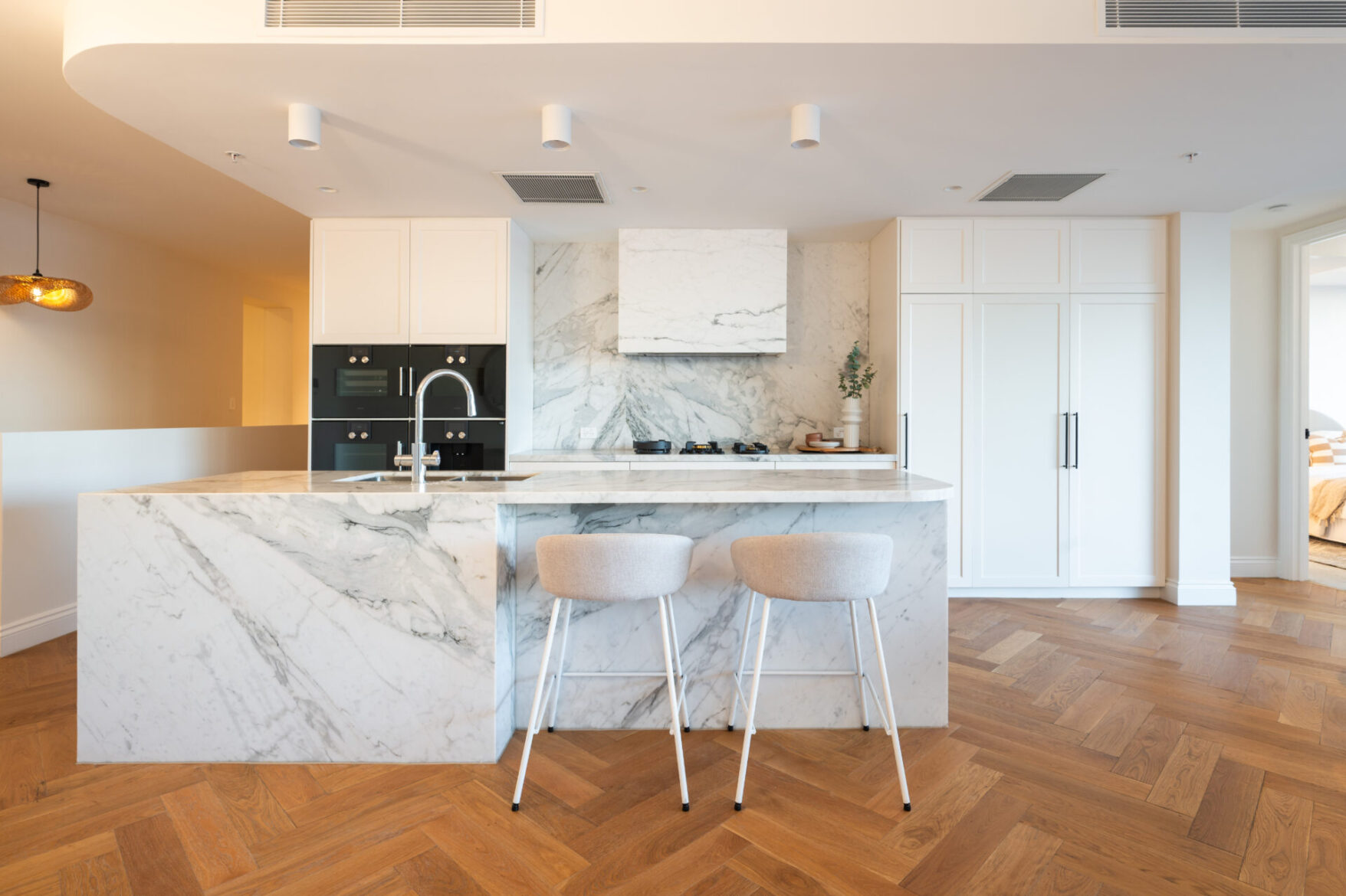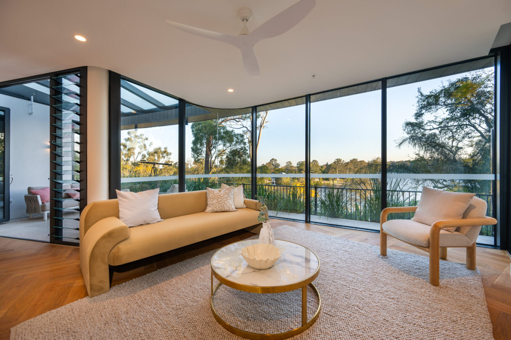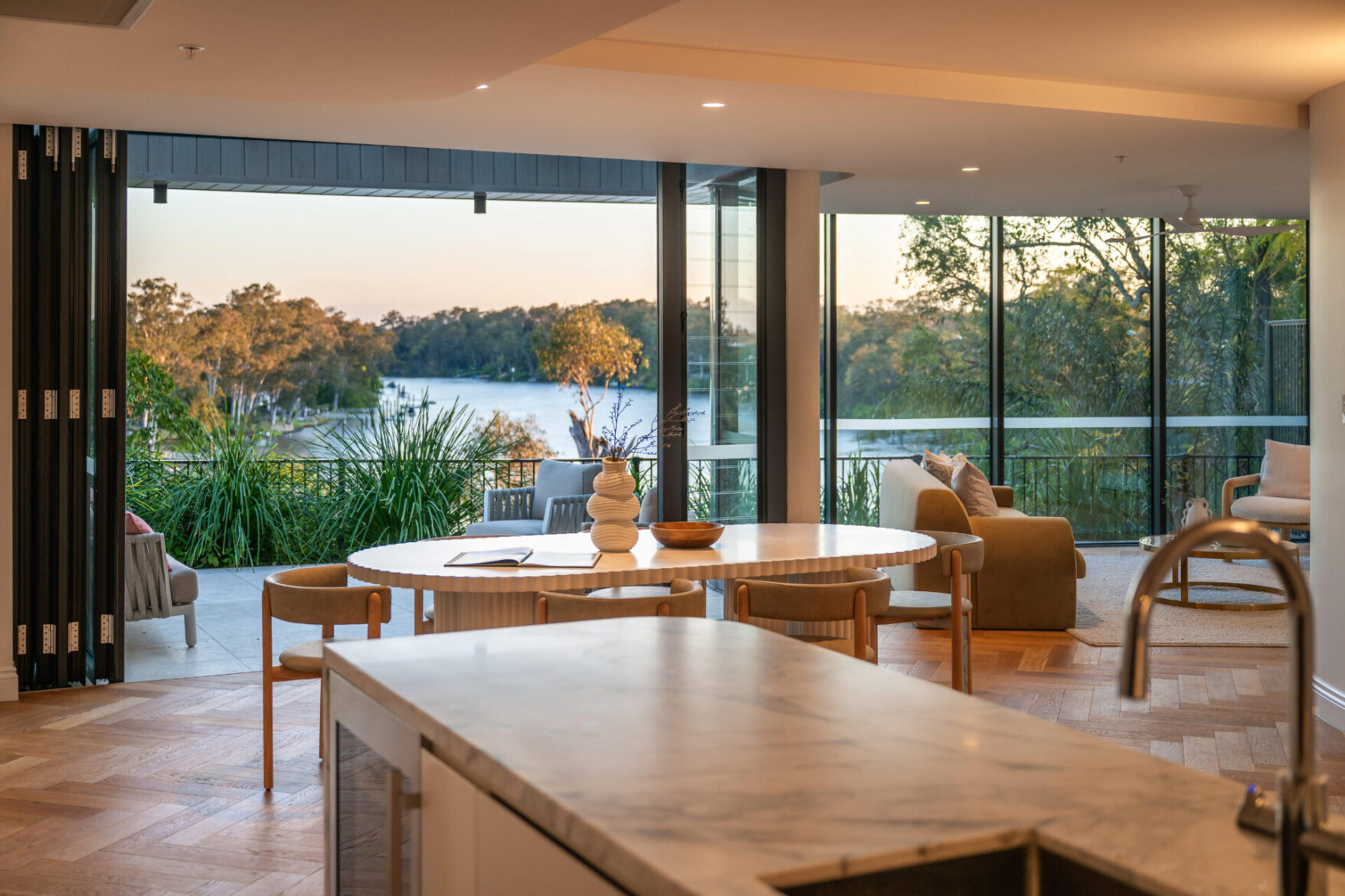 Across two expansive levels and 346m² of refined interiors, the residence is a masterclass in understated luxury. Herringbone oak floors, marble finishes, bespoke cabinetry and designer lighting all speak to an attention to detail rarely seen. At its heart, a Gaggenau-appointed kitchen and butler’s pantry set the stage for effortless entertaining, while curved glass walls draw the river into your everyday life.