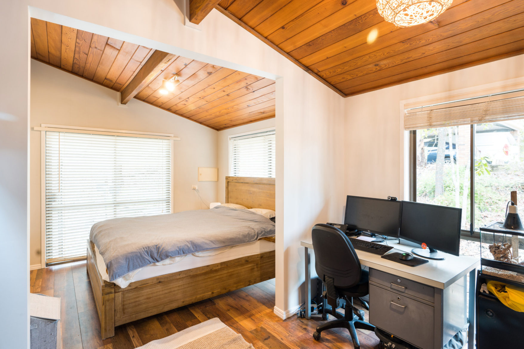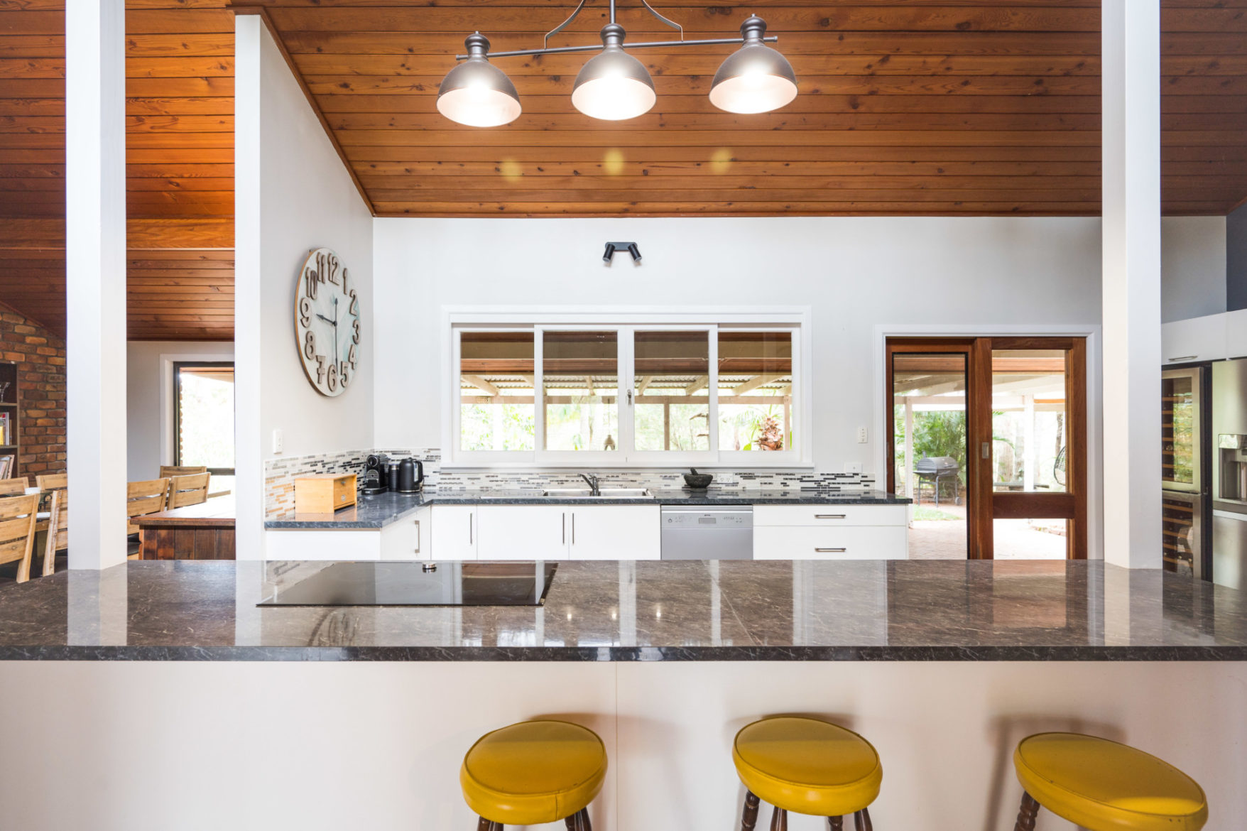 Soaring vaulted timber-lined ceilings and a huge pop-up skylight welcome in natural elements such as sunlight and breeze, presiding over the home’s sprawling, single-level layout, perfect for growing or multigenerational families who can be accommodated with ease.