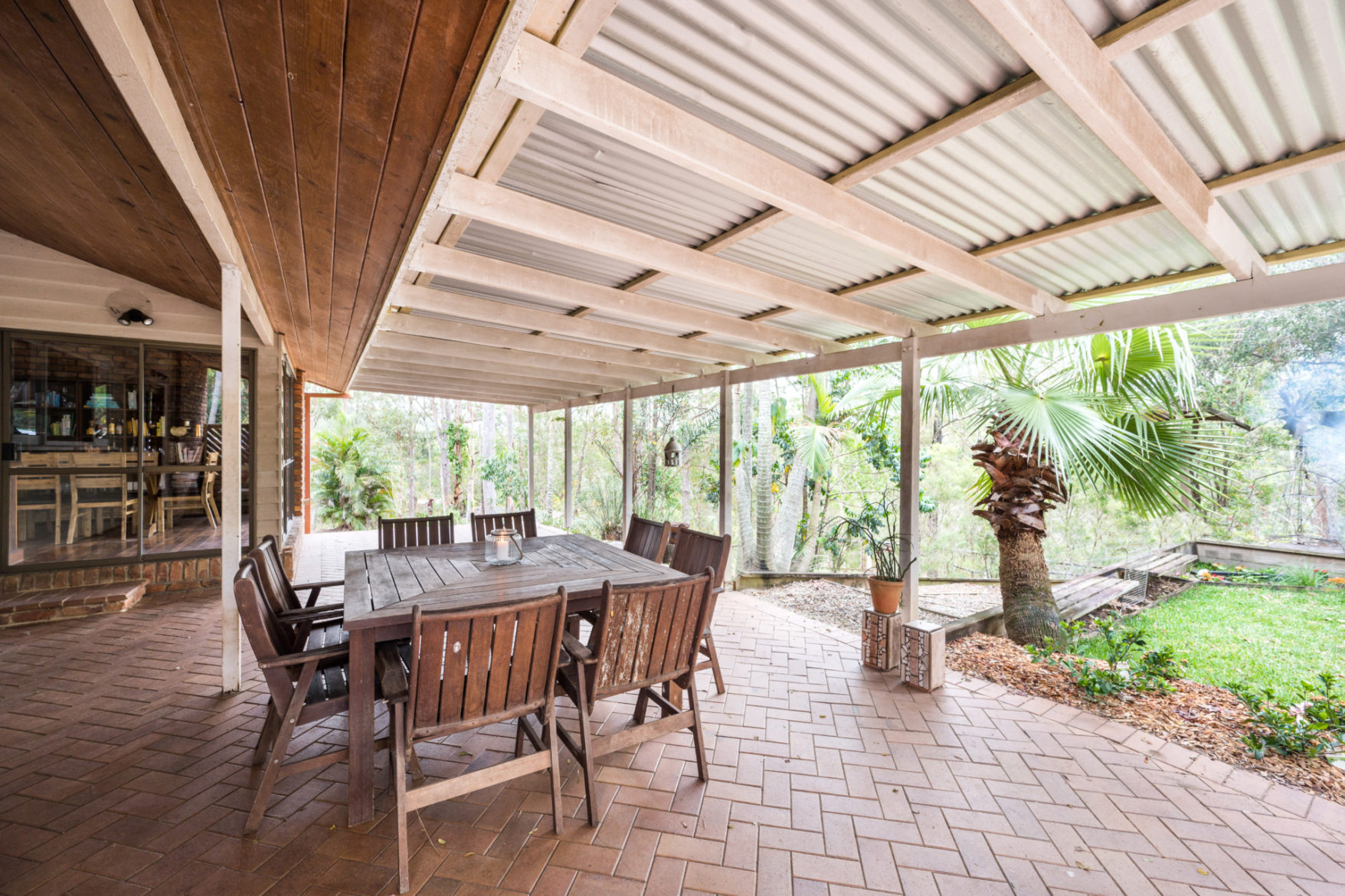 A generous covered entertaining area extends out back from the kitchen, with a separate covered entertaining hut, outdoor firepit area and timber-framed courtyard embracing a stunning outlook over the home’s bushland setting marked by an abundance of both tropical and native trees.